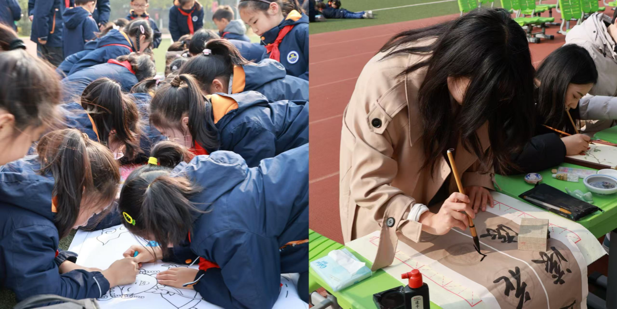 接着是书画实践环节。随着《中华民族一家亲》音乐声响起,操场中央一幅洁白的巨幅长卷徐徐铺开。小学生们用稚嫩却充满想象的笔触,勾勒出鲜艳的民族服饰、欢快的舞蹈人物,童心绘长卷,稚手连万里,民族团结的同心圆在斑斓画卷中绽出烂漫明天;大学生们则以“民族团结一家亲”为主题进行书画创作,丹青翰墨,青春华章,共绘中华民族共同体意识的时代画卷。