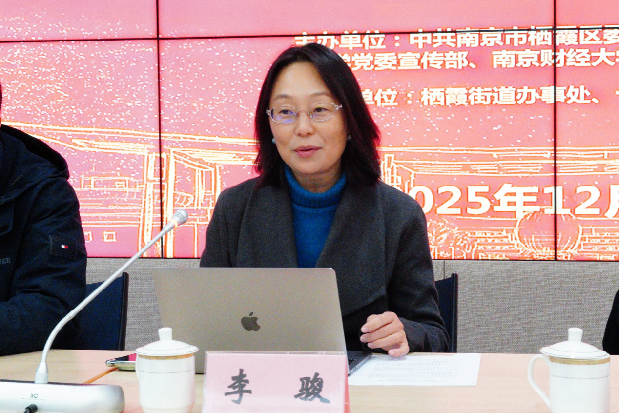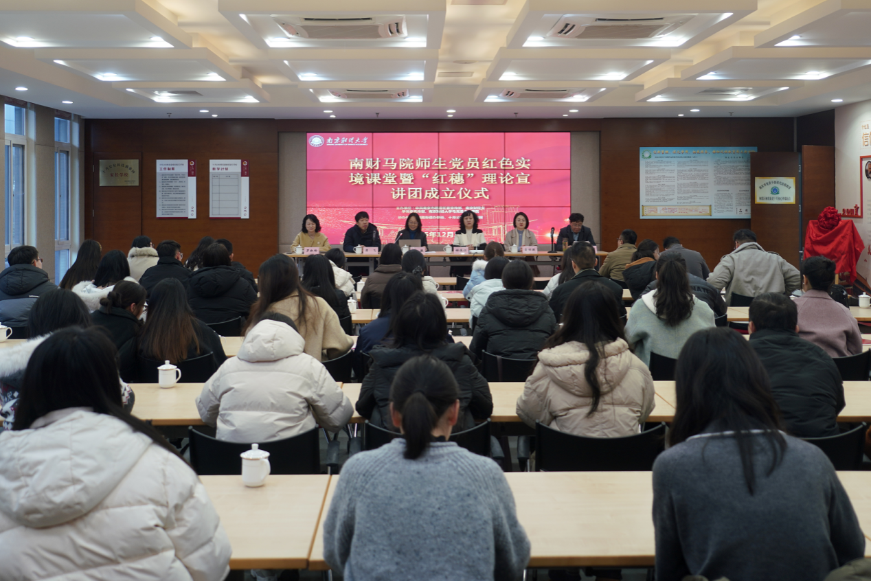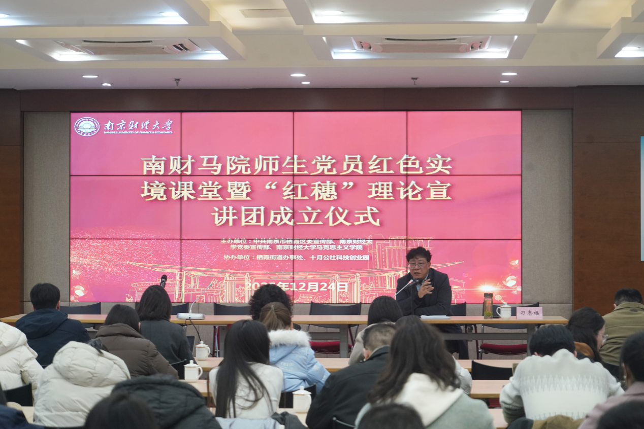 为深入推进党史学习教育常态化长效化,传承红色基因,将党的创新理论与乡村振兴实践深度融合,南京财经大学党委宣传部、马克思主义学院于12月24日在南京十月公社科技创业园与中共南京市栖霞区委宣传部、栖霞街道办事处共同举办“赓续红色血脉,践行共同富裕”红色实境课堂暨“红穗”理论宣讲团成立仪式。栖霞区委宣传部常务副部长钟漫江、栖霞区委宣传部副部长兼文明办主任罗红玲、栖霞区委党史办一级调研员刁志福以及马克思主义学院师生党员、基层理论工作者代表等60余人齐聚现场,共赴这场红色宣讲与共富实践的盛会。校地双方的相关部门代表、师生党员、基层理论工作者代表等60余人参加活动。