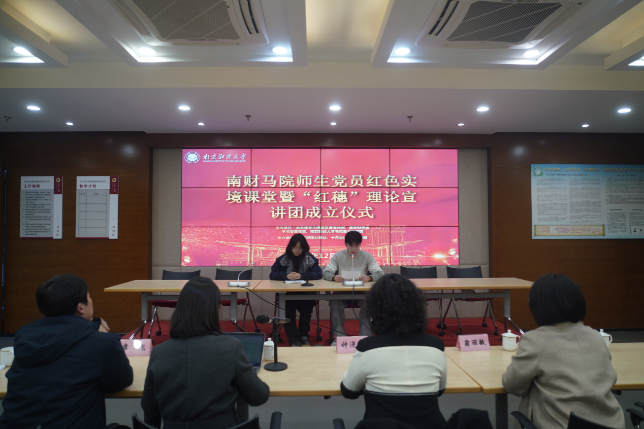 作为活动的核心环节,“红穗”理论宣讲团成立仪式简洁而庄重。南京财经大学马克思主义学院党委书记李骏宣布宣讲团正式成立,栖霞区委宣传部常务副部长钟漫江、南京财经大学党委宣传部副部长(挂)席飞共同为宣讲团揭牌。