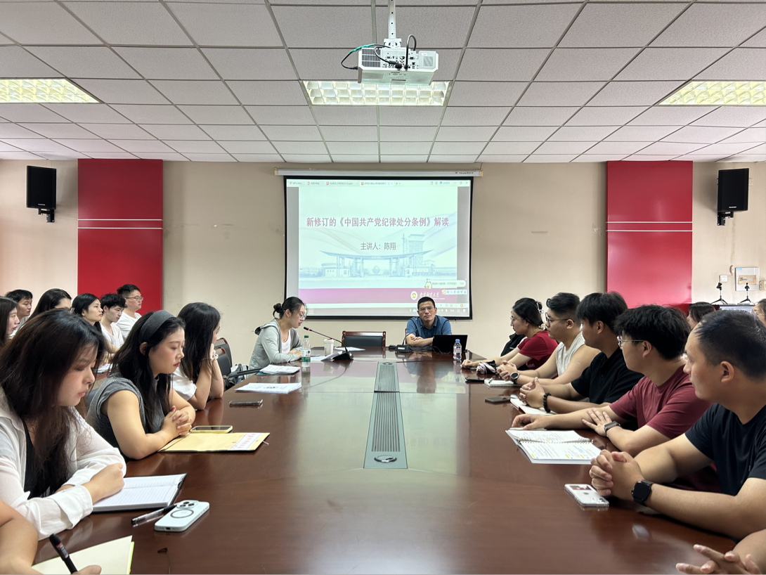 会议共有两项核心议程,一是介绍研究生党支部基本情况,以及入党的基本要求和流程。二是学院党委书记陈翔老师为新生讲授党课——对新修订的《中国共产党纪律处分条例》解读。